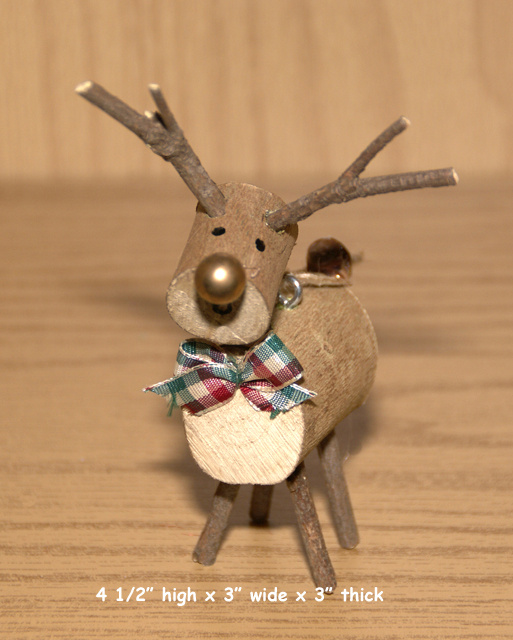 Lil' Antlersare unique handmade creations. The body is made using hand cut natural logs from a variety of trees from Georgia and North Carolina. The legs and antlers are made with twigs and sticks from Holly and other small branches. They are decorated with a colorful nose, a bright bow and a pine bark nugget (or pine cone fron) for a tail.